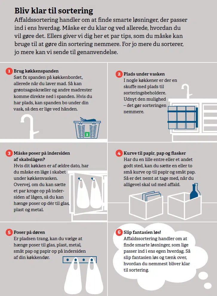 Affaldssortering handler om at finde smarte løsninger, som lige passer ind i ens egen hverdag. Så slip fantasien løs og tænk over, hvordan du nemmest bliver klar til sortering.