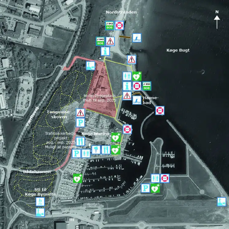Kort 1, oversigtskort over Nordstranden og Havnebad Køge Marina med pictogrammer, der viser hvilke faciliteter der findes og hvor de er placeret