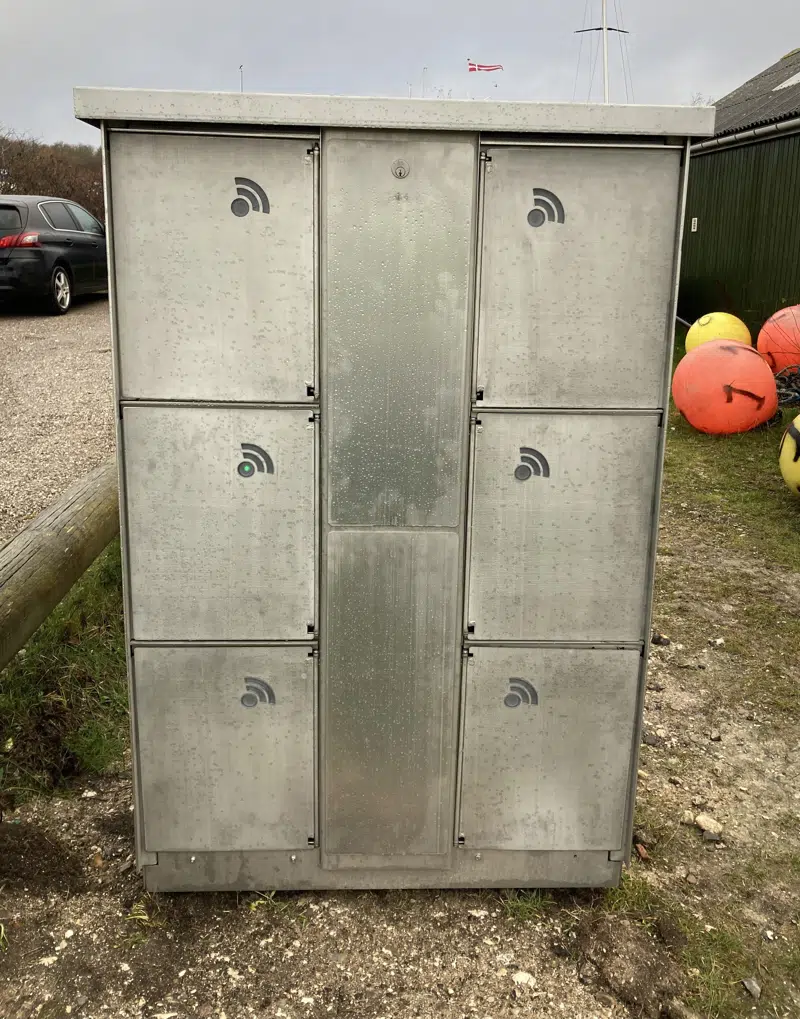 Cykelbokse åbnes ved at ringe til boksens telefonnummer, som du finder på selve boksen. - Køge Marina: 6 skabe til cykelbatteri og andre mindre ejendele.