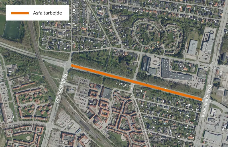 Fra mandag den 28. juli udføres asfaltarbejde på Lyngvej mellem Københavnsvej og Stensbjergvej. Der vil altid være en fri bane i hver retning - men forvent kø.