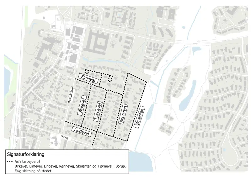 Mellem 3. og 11. oktober 2024 udføres der asfaltarbejde på Birkevej, Elmevej, Lindevej, Rønnevej, Skrænten og Tjørnevej i Borup.