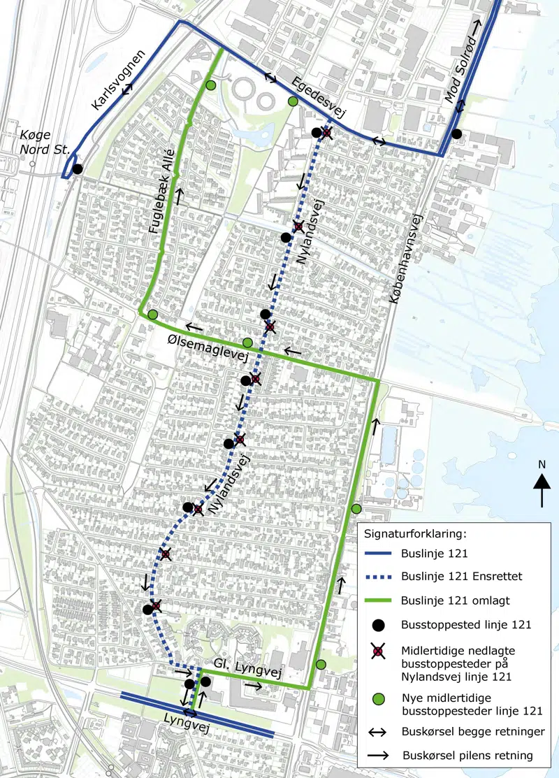 I forbindelse med fjernvarmearbejder på Nylandsvej ensrettes dele af vejen, jf. nedenstående kort.