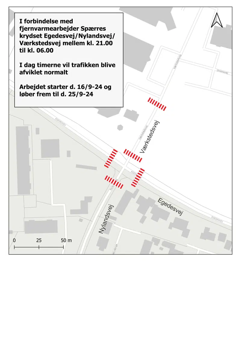 I forbindelse med fjernvarmearbejde vil krydset Egedesvej/Nylandsvej/Værkstedsvej være spærret fra kl. 21.00 til kl. 06.00 i perioden 16. september til 5. oktober 2024.