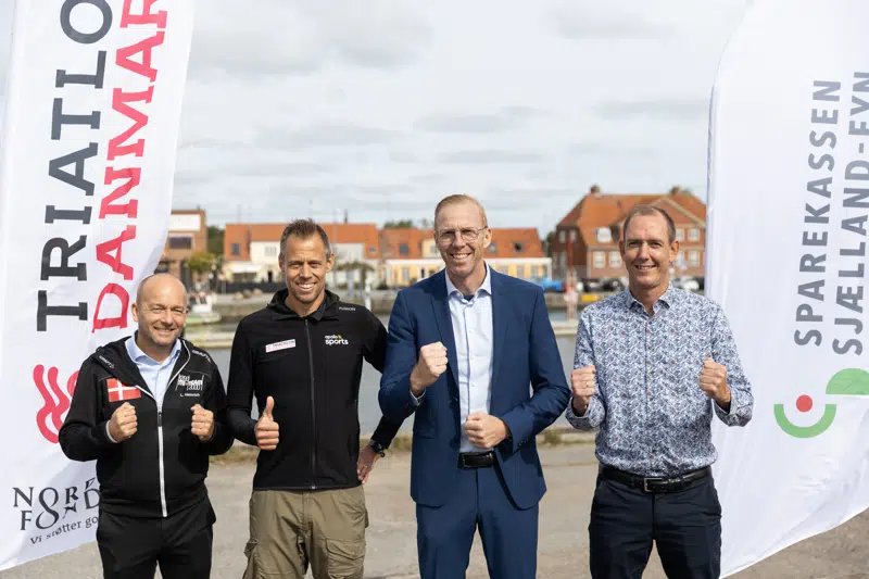 Fra venstre: Lars Heinrich (Formand Køge Tri Team 2000), Rasmus Henning (Direktør og Sportschef Triatlon Danmark), Ken Kristensen (Viceborgmester og Formand Kultur og Idrætsudvalget, Køge Kommune) og Ole Mogensen (Sparekassen Sjælland-Fyn, Filialdirektør i Køge).