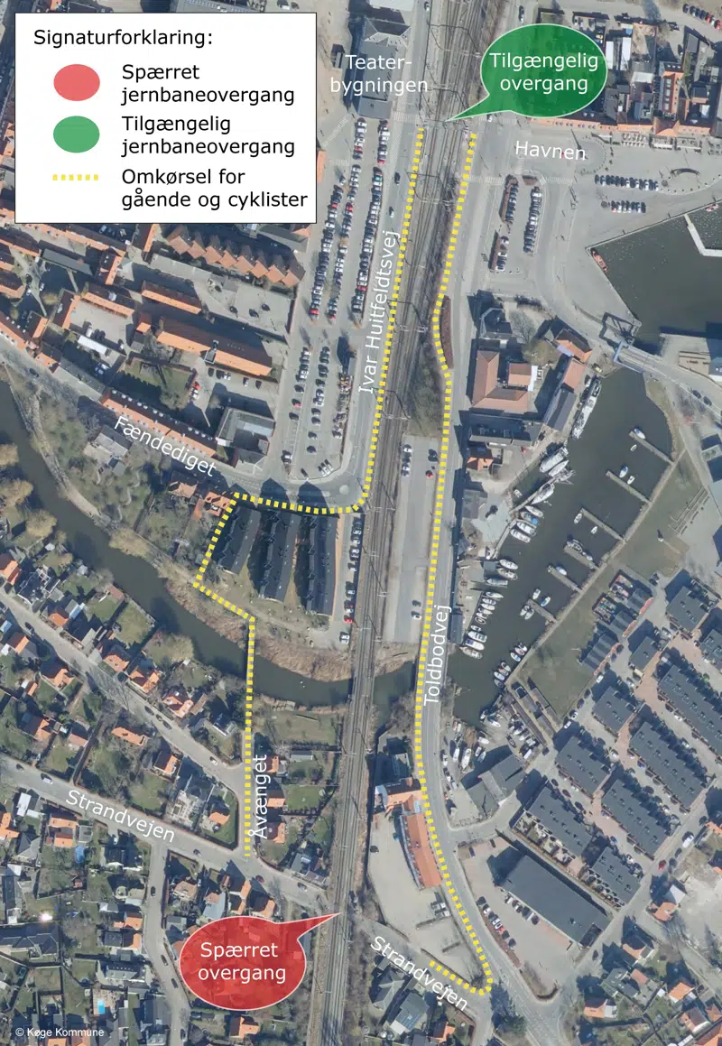 Der skiltes i området med omkørsel via overgangen ved Teaterbygning og Havnen.