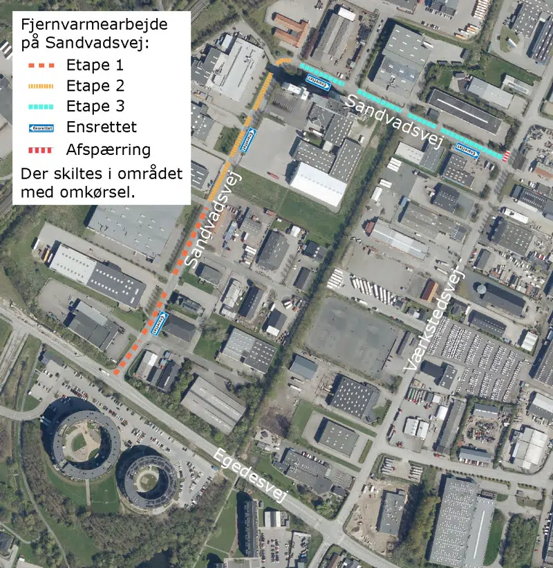 Der bliver lagt fjernvarme på Sandvadsvej. Derfor ensrettes vejen fra den 9. december 2024 kl. 07.00 til den 1. februar 2025 kl. 15.00.
