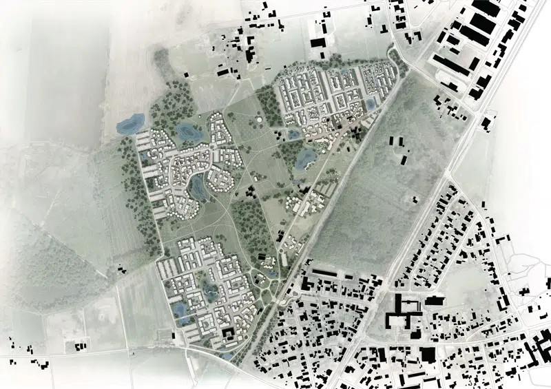 Illustration af udviklingen af bydelen Herfølge Bjergby (© WERK & Vandkunsten)