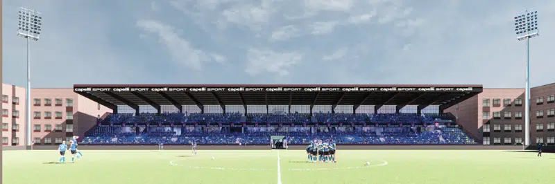 Illustration af den kommende østlige tribune fra totalentreprenør Pihl/LM Byg.