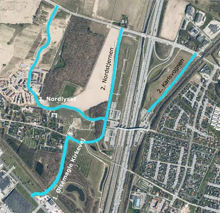 Nordstjernen og Karlsvognen er begge blevet til i samarbejde med Banedanmark i forbindelse med etableringen af København-Ringsted banen og Køge Nord St. De matrikulære berigtigelser er endnu ikke på plads, men Køge Kommune har godkendt principbeslutning og detailprojekt for vejene. I samme ombæring er der foretaget nedenstående ændringer langs banen: